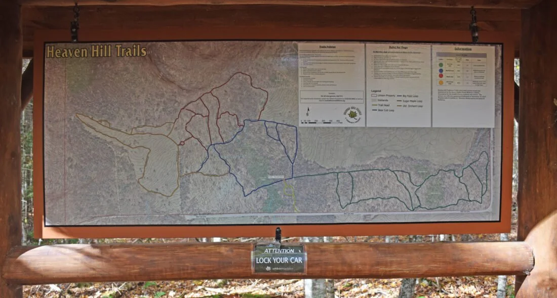 Although the trails were not too busy on the Tuesday afternoon that I visited, those I crossed paths with almost all had dogs with them. They were all well-behaved and were enjoying the outing as much as their owners. Many hiking trails in the area prohibit dogs or require them to be leashed at all times. This is not the case at Heaven Hill, where dogs can roam with a bit more freedom. Absolutely crucial to this privilege remaining in place are dog owners following the rules below: First and foremost, aggressive dogs, either to humans or other canines, are not allowed. While dogs do not have to be leashed, owners must always carry a leash and immediately put it on if there is any signs of aggressive behavior. Dogs must always remain in sight of their owners, and be able to respond to their voice commands. No more than three dogs per person or group are allowed. Owners must pick up and pack out any dog waste. Pouches for waste were available at the trailhead as of press time, although owners should be prepared and have their own on hand if provided pouches are unavailable in the future.